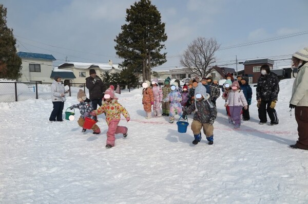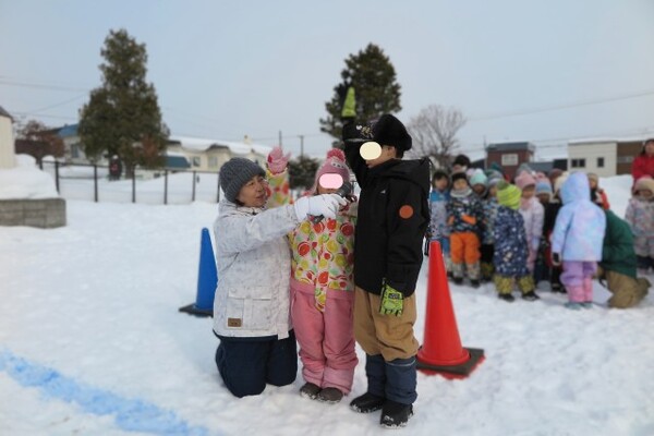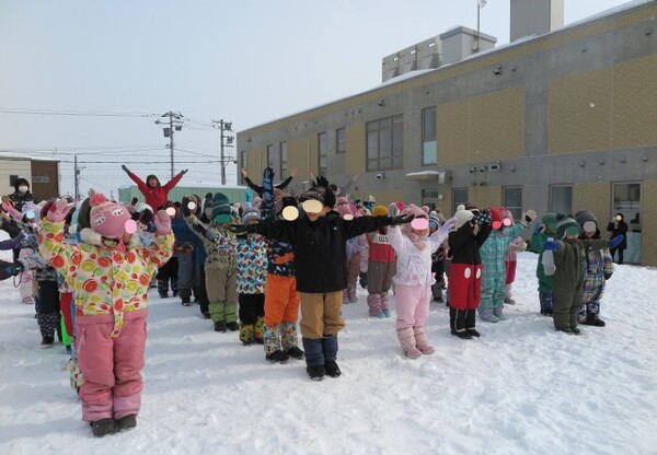 それからみかんジュースをお鍋にそそいで寒天と混ぜ、外に出して冷やして固まるのを待ちました。子どもたちは「かたまったかな?」「もうちょっとかな〜」と何度もさわって確認していました。