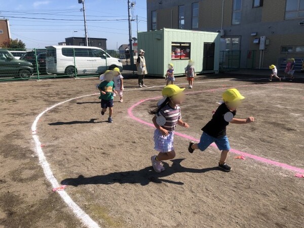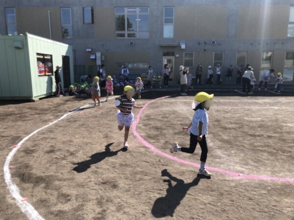 スタートから勢いよくダッシュして途中で失速する子や、疲れて歩いたりする子もいましたが、おともだちや保護者の方々の「がんばれ〜!」という声援や「あと少し〜」という掛け声に励まされ、後半は元気を取り戻し、15分間完走することができました。中には39週も走った子もいました。