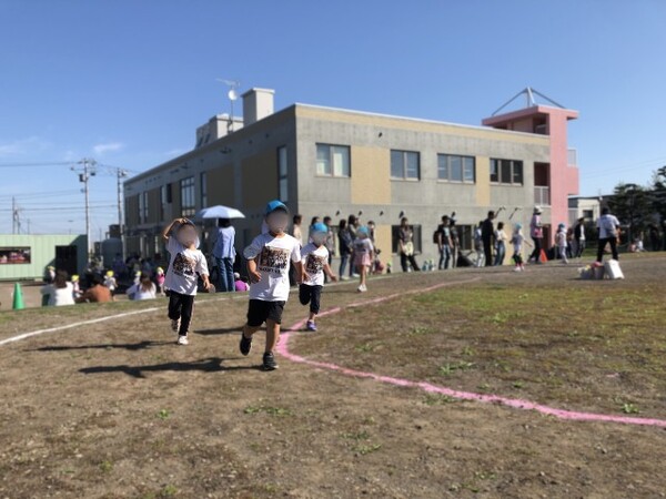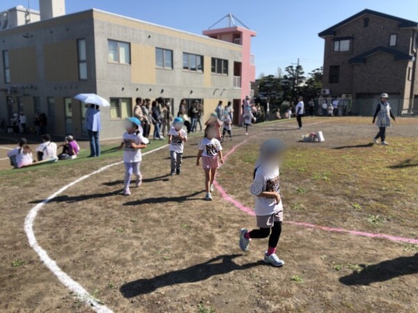 準備体操でからだをあたためてから「よーいドン!」の合図で走り出した子どもたち。