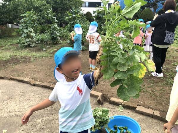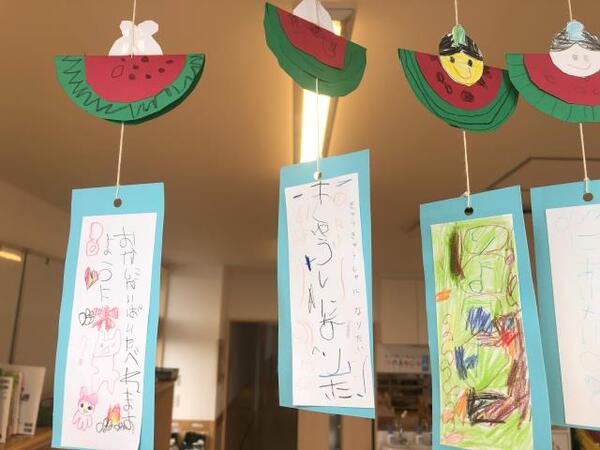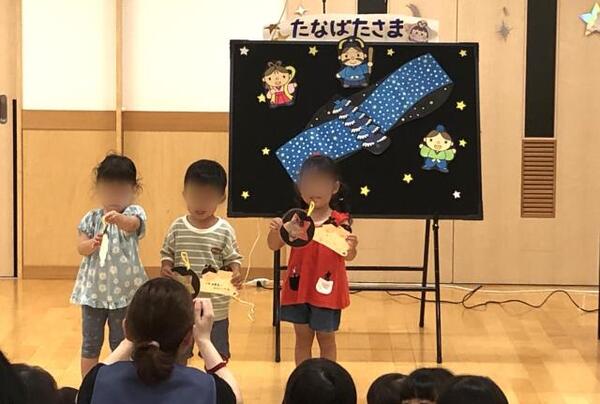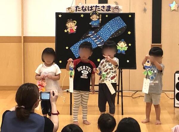 7月24日、7月の小遠足で公園に行く予定だったのですが、気温35度で熱中症警戒アラートが出ていたので、保育園でいろいろな遊びを楽しんでお部屋でおべんとうを食べました。